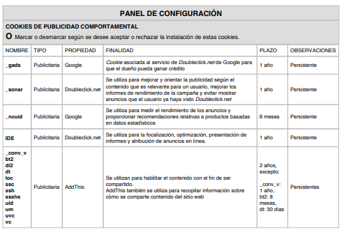 - Cookies publicitarias: Muestran publicidad en función de su navegación, su país de procedencia, idioma, etc.